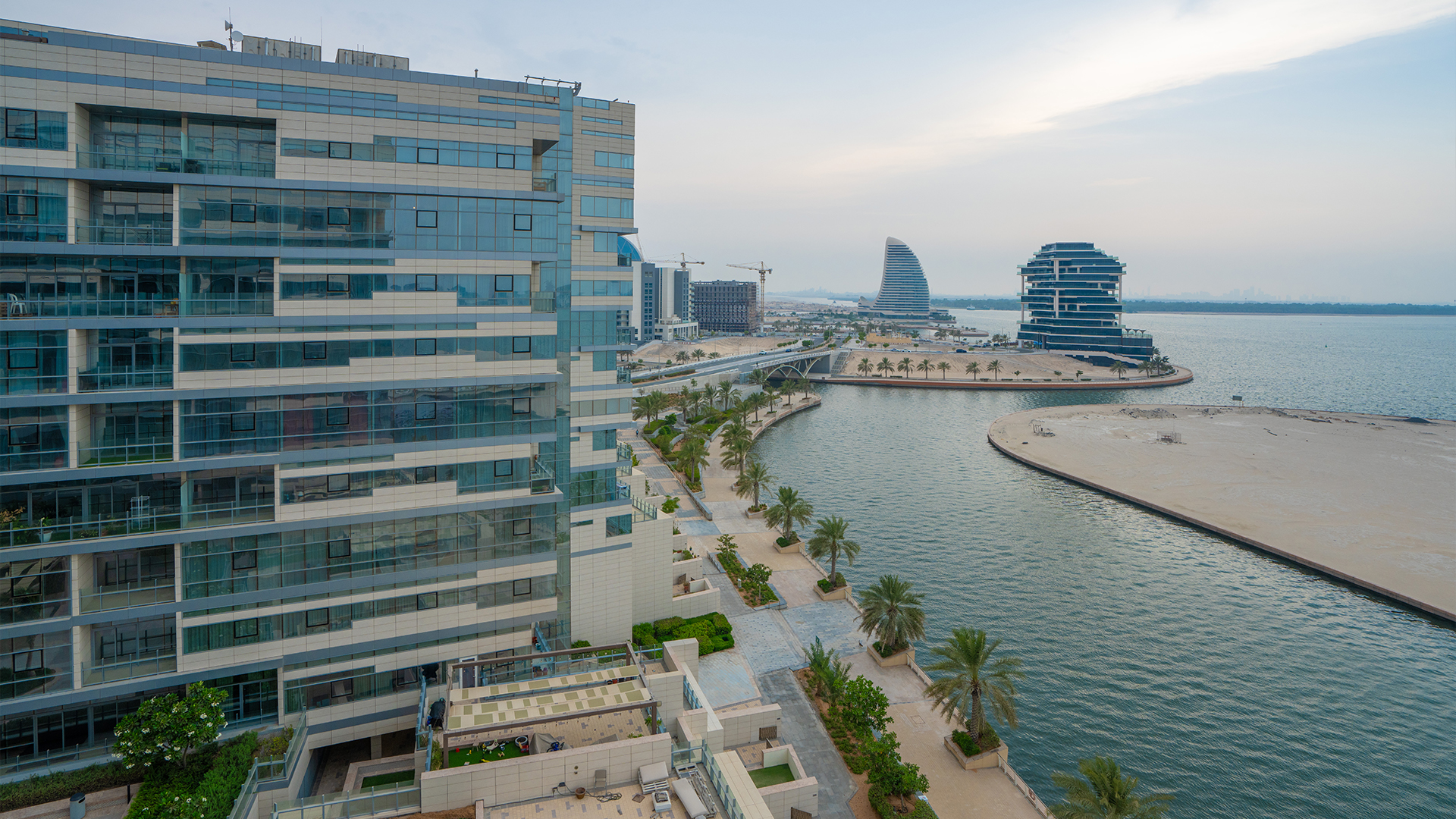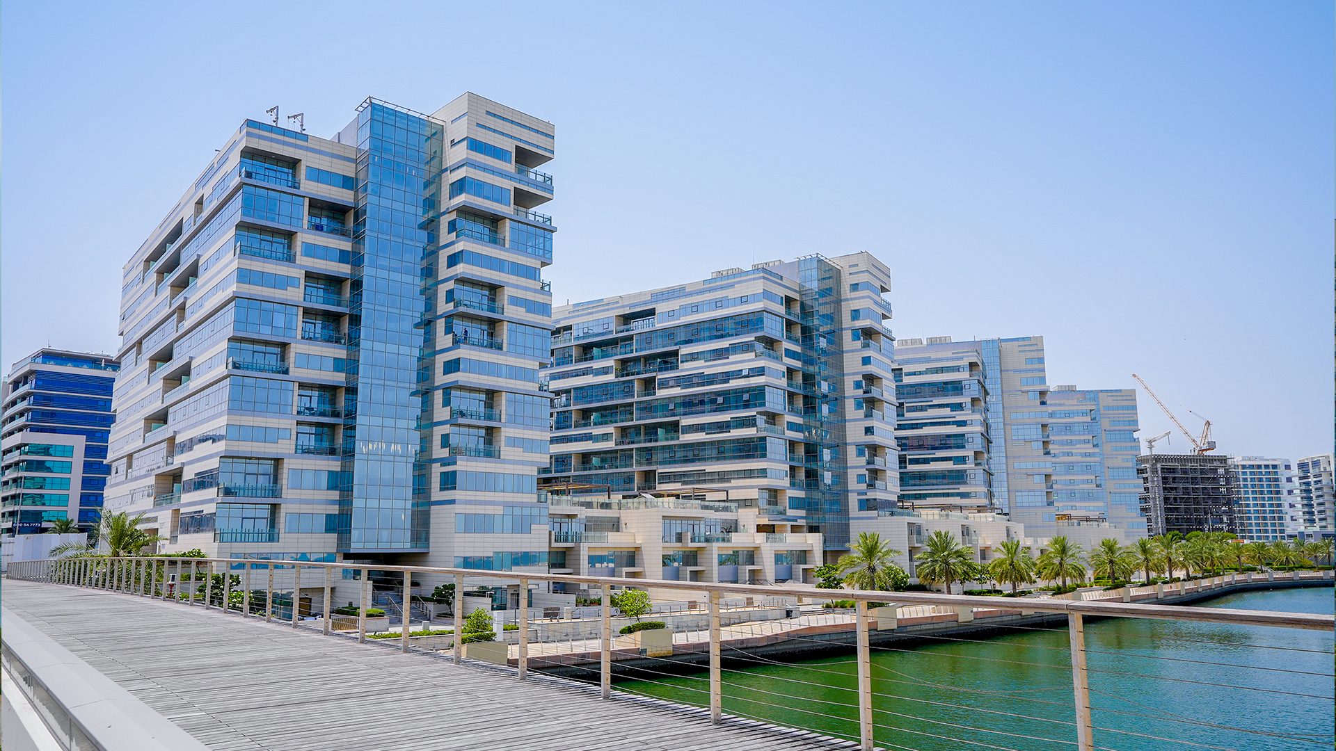 Along the Abu Dhabi–Dubai highway corridor, between Yas Island and Khalifa City, with direct frontage on the Arabian Gulf and the Al Raha canal network.